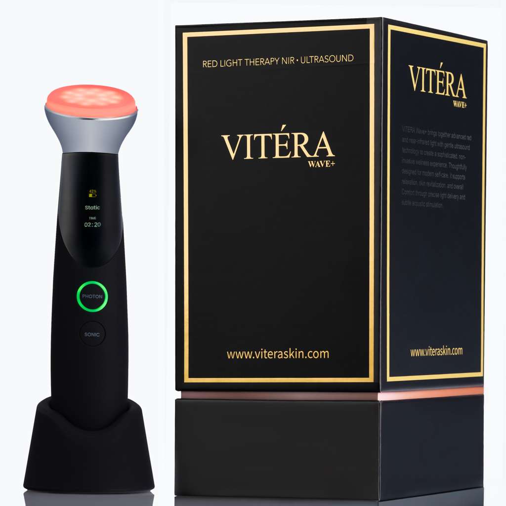 Vitera Wave™ is an advanced handheld beauty and wellness device that combines red light, near-infrared light, and ultrasound technology in one elegant system. Designed to support skin rejuvenation and targeted wellness, it brings modern treatment technology into a refined at-home ritual